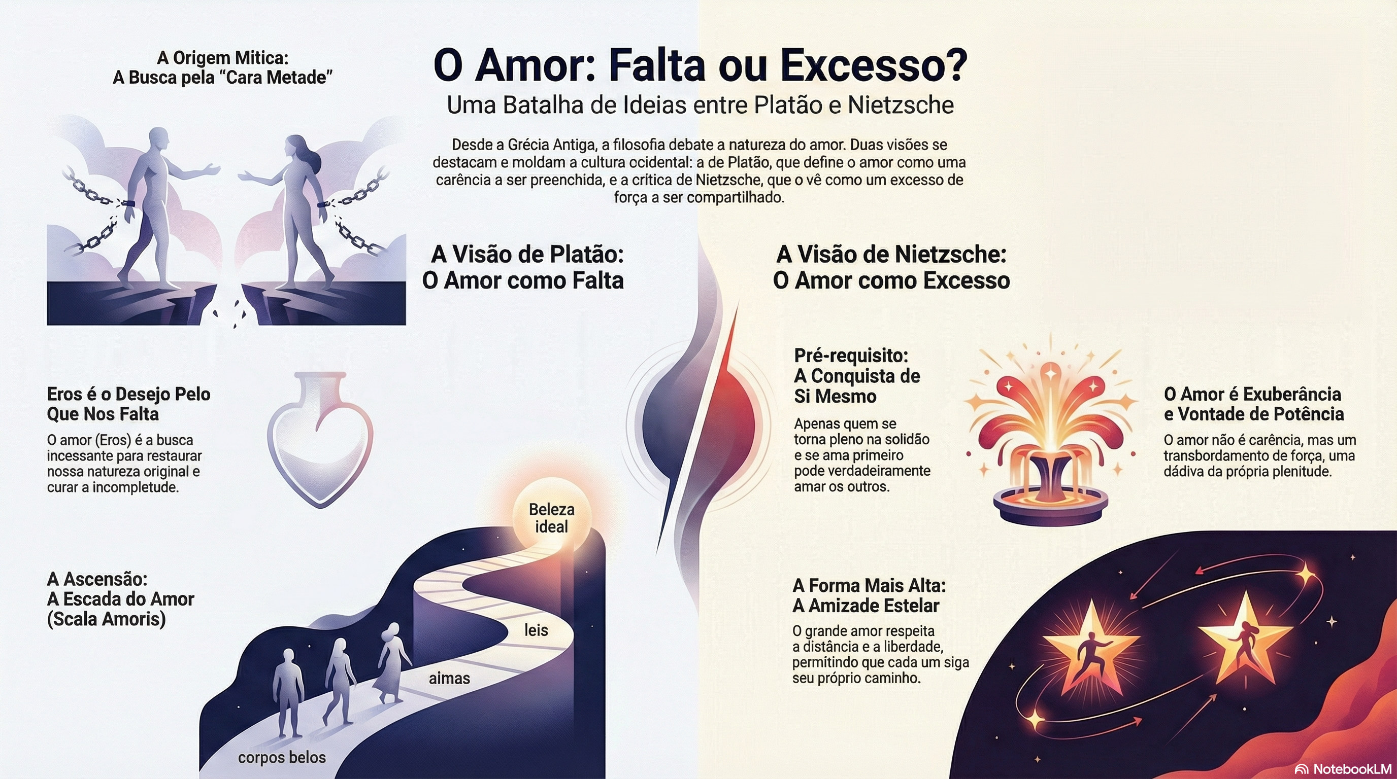 3. Amizade Estelar vs. Fusão: Nietzsche valoriza a amizade (philia) como uma forma superior de amor, onde se respeita a distância e a diferença. É a “amizade de astros”, onde dois navios seguem rotas próprias, celebrando a existência do outro sem tentar possuí-lo ou fundir-se a ele.