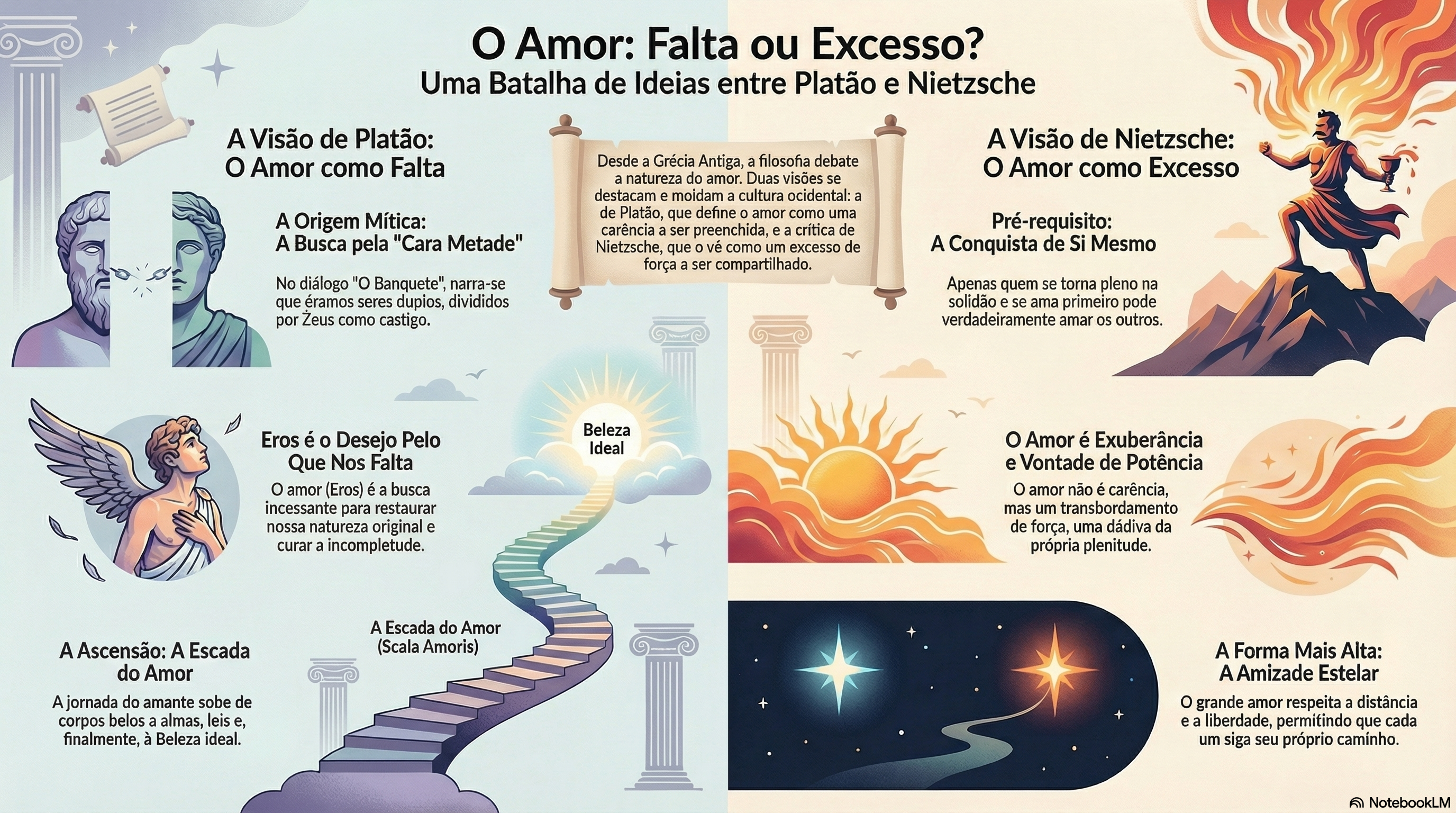 É nesse cenário de consumo de vinho que surgem as definições platônicas de amor (Eros), que Nietzsche posteriormente criticará ferozmente. No Banquete, através do mito narrado por Aristófanes, o amor é apresentado como a busca por uma completude perdida. Originalmente, os seres humanos seriam esféricos e duplos, mas, punidos por sua arrogância, foram cortados ao meio por Zeus. Desde então, o amor é o desejo e a procura dessa “metade perdida”, uma tentativa de curar a natureza humana mutilada.